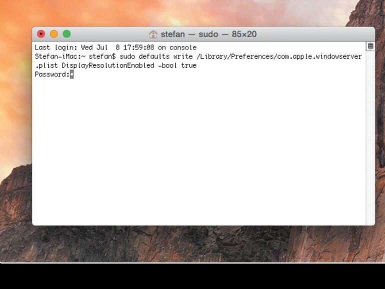 sudo · defaults · write · /Library/Preferences/com.apple.windowserver.plist · DisplayResolutionEnabled · bool · trueein, gefolgt von Enter. Sie müssen den Befehl mit einem Admin-Passwort bestätigen.