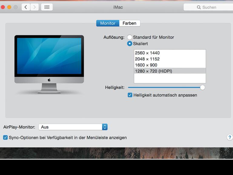 2 Öffnen Sie Systemeinstellungen > Monitore. Halten Sie beim Klick auf Skaliert die Wahltaste. Einige Auflösungen sind mit „niedrige Auflösung“ markiert. Wählen Sie diese, wird der Desktop entsprechend proportioniert, aber dennoch höher aufgelöst dargestellt.