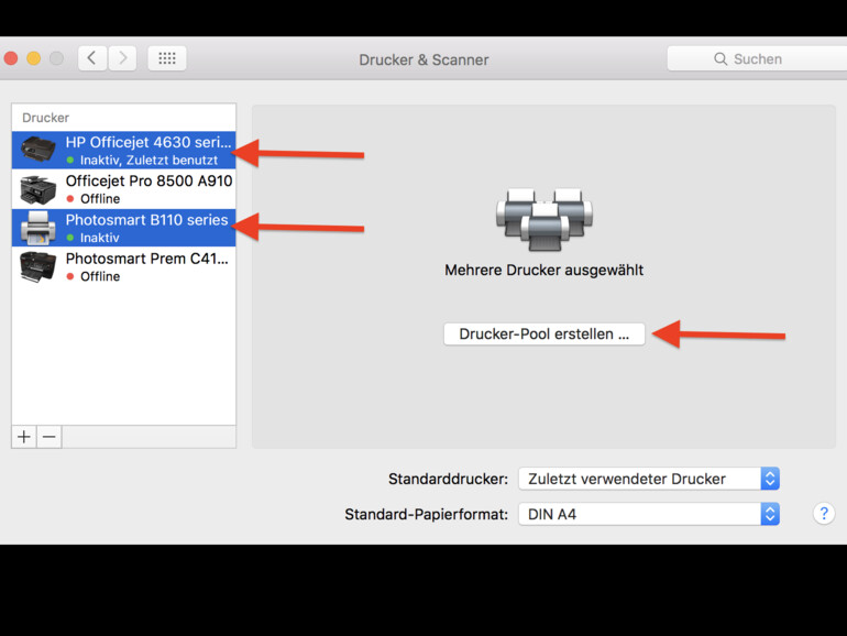 Wählen Sie bei gedrückter Befehlstaste (cmd) die gewünschten Drucker aus der Seitenleiste aus. Schon während der Auswahl erscheint in dem Fenster die Option „Drucker-Pool erstellen“. Klicken Sie darauf.