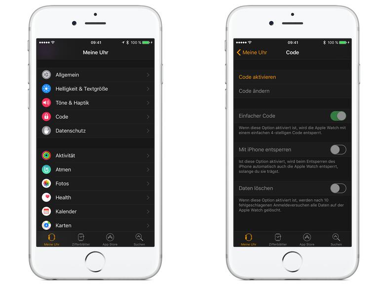 In der Watch-App Ihres iPhone finden Sie im Reiter „Meine Uhr" unter dem Menüpunkt „Code“ diverse Einstellmöglichkeiten. Hier können Sie auch die Sperre sowohl aktivieren, deaktivieren oder später auch den Code ändern. Zusätzlich bietet man Ihnen die Möglichkeit, bei mehrfacher Falscheingabe des Codes sämtliche Daten von der Apple Watch zu löschen. Gerade wegen sensibler Daten (Apple Pay, Fitness Daten, Nachrichten, usw.) sollte man die letzte Option aktivieren. Um den Code nicht immer auf dem kleinen Display eingeben zu müssen, können Sie die Entsperrung an die gleichzeitige Entsperrung des iPhone koppeln.