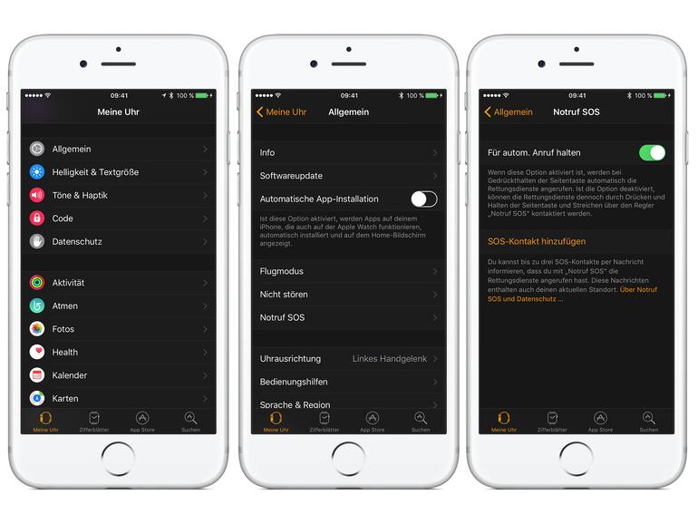 Nehmen Sie das mit Ihrer Apple Watch gekoppelte iPhone zur Hand und öffnen Sie die Watch-App. Wählen Sie im Reiter „Meine Uhr" erst den Punkt „Allgemein“ und dann „Notruf SOS“ aus. Schieben Sie den Regler neben „Für autom. Anrufe halten“ nach rechts, damit Sie zukünftig die Seitentaste nur sehr lange gedrückt halten müssen, um einen Notruf abzusetzen.