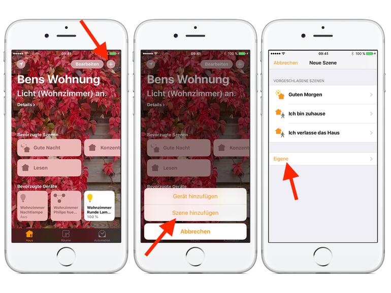 Um die Szene zu erstellen, öffnen Sie zunächst die Home-App auf Ihrem iPhone oder iPad. Oben rechts tippen Sie dann auf das Plus-Symbol und wählen schließlich die Option „Szene hinzufügen“ aus.