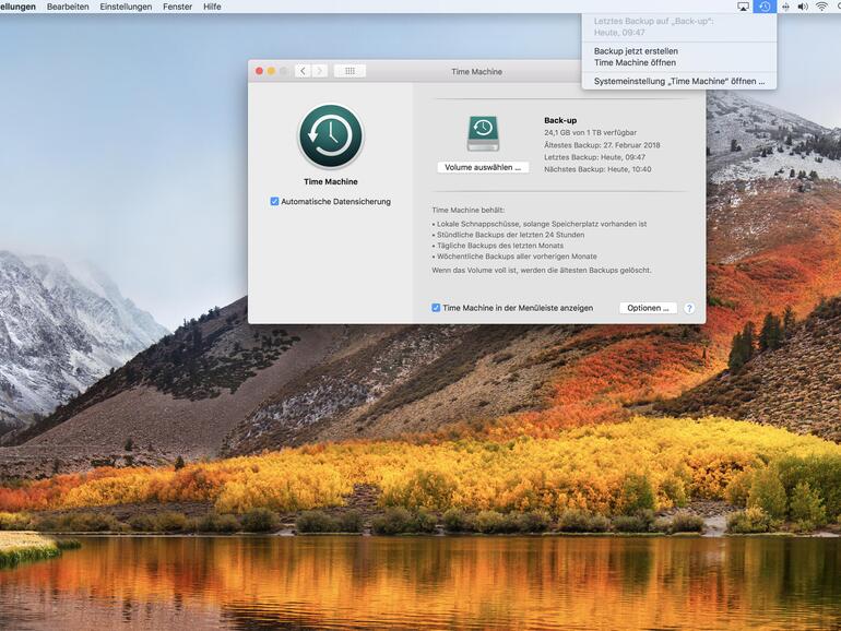 Das erste Back-up wird einige Zeit dauern, aber anschließend werden nur noch die Änderungen gespeichert. Sofern Sie ein Back-up nicht manuell anstoßen (über das Icon in der Menüleiste) wird es stündlich ausgeführt.