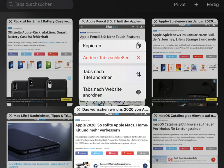 Safari öffnet aufgerufene Webseiten bekanntlich in Karteireitern (neudeutsch: Tabs). Alle geöffneten Tabs sehen Sie unterhalb der Adressleiste. Allerdings lässt sich hier nur der Titel erkennen – eine wirklich Ordnung gibt es nicht, da iPadOS einen neuen Tab stets rechts von den bestehenden hinzufügt. Allerdings gibt es in Version 13 (und neuer) die Möglichkeit, die geöffneten Reiter nach Titel oder dargestellter Website zu ordnen, um etwas mehr Übersicht zu schaffen.