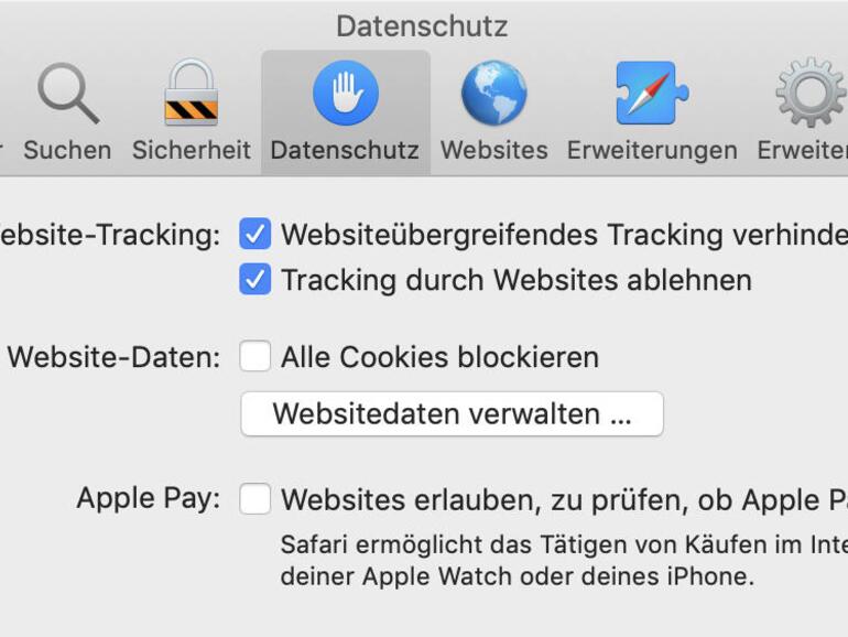 Die vielleicht wichtigste Änderung an Safari spielt sich im Verborgenen ab. Schon die vorherige Version konnte in gewissen Grenzen verhindern, dass der Benutzer über mehrere Websites hinweg verfolgt werden kann. Das klappte teils recht gut und machte es Anzeigenanbietern deutlich schwerer, den Benutzern zielgerichtete Werbung unterzujubeln. In macOS 10.14 hat Apple hier aber nochmal einige Schlupflöcher geschlossen und unterbindet Skripte, die sich typischerweise in Knöpfen sozialer Medien verbergen. Um das websiteübergreifende Tracking zu unterbinden, ist wie zuvor eine Checkbox in den Einstellungen zuständig. Diese sorgt auch dafür, dass Webanbietern, die den Rechner anhand von Browserversion und anderen Merkmalen wiedererkennen wollen, ein vereinfachtes Profil geboten wird, mit dem diese nichts anfangen können.
