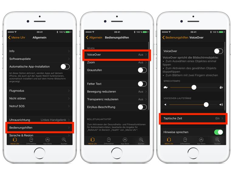 In den Bedienungshilfen wählen Sie danach die Option „Voice Over" aus und ziehen anschließend den Schieberegler nach rechts, um die Funktion zu aktivieren. Deaktivieren Sie nach Belieben die Option „Beim Anheben sprechen". Tippen Sie jetzt auf „Taptische Zeit". Schieben Sie den Regler neben „Taptische Zeit aktivieren" nach rechts und wählen Sie dann den gewünschten Stil für die Benachrichtigungen aus. Sie können die Watch-App jetzt wieder verlassen. Um das Feature nun auf der Apple Watch zu nutzen, aktivieren Sie das Display und tippen Sie zweimal darauf, um die Zeit per Vibration zu „erfühlen“.