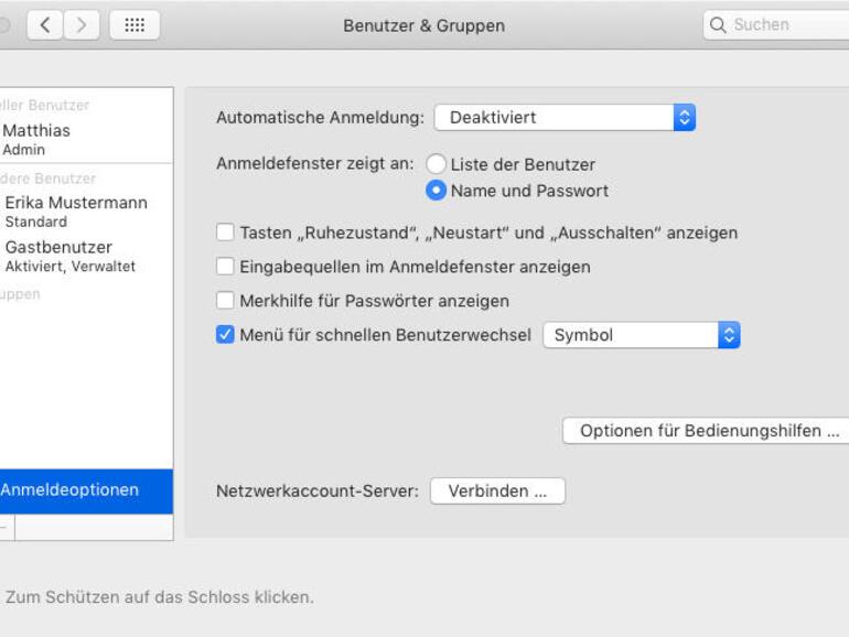 S chalten Sie in den Anmeldeoptionen in „Benutzer & Gruppen“ die automatische Anmeldung aus, am besten auch die Benutzerliste. Vorsicht: Die Merkhilfe zum Passwort hilft auch anderen beim Raten!