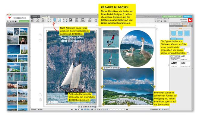 Designer 3 bietet dazu zahlreiche Optionen, die Sie woanders meist vergeblich suchen: Sanfte Verläufe lassen Fotos mit dem Hintergrund verschmelzen, kreative Fotoecken „heften“ Ihre Bilder auf die Fotobuchseiten, Bildboxen können in frei eintippbare Buchstaben und Texte gewandelt werden und die Rahmen lassen sich wie in professionellen Satzprogrammen detailliert verändern. Mit Werkzeugen zum Übertragen der einmal angelegten Rahmenstile auf andere Bildboxen und mit individuellen Stilvorlagen erleichtert Designer 3 die Vereinheitlichung Ihrer Gestaltung ungemein. Probieren Sie es aus!