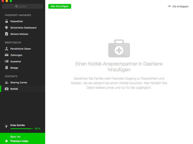 Erwähnenswert ist die Funktion eines Notfallkontaktes zur Nutzung Ihrer Dashlane-Anwendung: Sie können einen Kontakt mit dessen E-Mail-Adresse zu Ihrem „letzten Ausweg“ machen. Falls Sie sich nun versehentlich „aussperren“ oder Ihnen gar etwas zustößt, kann dieser Kontakt den Log-in für Sie übernehmen. Damit ist auch der schlimmste Notfall abgedeckt.