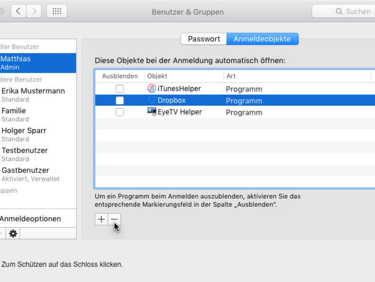 Ist ein Problem beim sicheren Systemstart vorübergehend nicht aufgetreten, könnte ein Anmeldeobjekt die Ursache sein, also eine App, die automatisch gestartet wird. Um das zu prüfen, meldest du dich ab und wieder an. Bei der Anmeldung hältst du aber nach Eingabe des Passworts die Umschalttaste gedrückt. Dadurch werden die Anmeldeobjekte nicht mehr geladen. Ist das Problem nun verschwunden, öffnest du in den Systemeinstellungen den Bereich „Benutzer & Gruppen“. Wähle dein Konto aus, und klicke im rechten Fensterbereich auf den Reiter „Anmeldeobjekte“. Du siehst nun die Apps, die bei der Anmeldung automatisch gestartet werden. Entferne eine nach der anderen, und prüfe jeweils mit einem Neustart, ob der Fehler beseitigt ist.