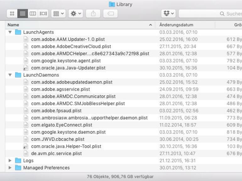 Einige Programme verwenden Hintergrund-Apps, die nicht in den Anmeldeobjekten des Benutzers auftauchen. Auch sie werden beim sicheren Systemstart übersprungen. Für globale Startobjekte findest du plist-Dateien, die den Pfad zur App enthalten im allgemeinen Library-Ordner, in „LaunchAgents“ und „LaunchDaemons“. Um sie als Fehlerquelle auszuschließen, entfernst du plist-Dateien vorübergehend und startest neu. Probleme mit den Startobjekten treten gern nach größeren Updates von OS X auf, die auch ein Update der Apps erforderlich machen. Früher wurden Startobjekte auch in „Library/StartupItems“ installiert.