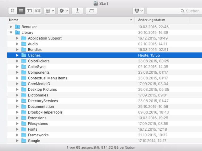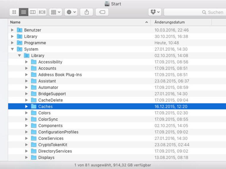 Das vorsorgliche Löschen von Cache-Dateien als „Systempflege“ ist eine weit verbreitete Unsitte. Bei der Fehlersuche macht es hingegen Sinn. Um fehlerhafte Cache-Dateien als Problemverursacher auszuschließen, bewegst du den Inhalt der Ordner „System/Library/Caches“ und „Library/Caches“ in den Papierkorb. Dafür musst du dich als Administrator identifizieren können. Danach machst du einen Neustart.