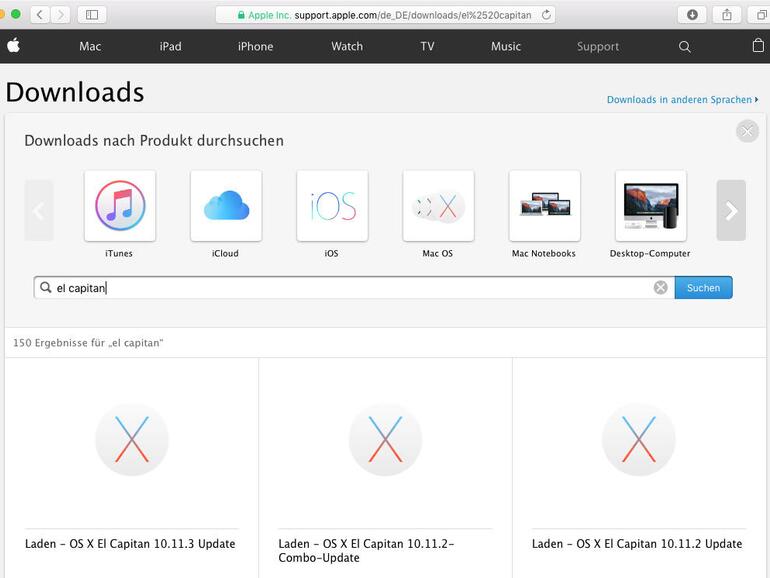 Hast du das Gefühl, dass OS X nicht zuverlässig arbeitet, kannst aber kein spezifisches Fehlerbild erkennen, hilft eventuell die manuelle Installation eines Combo-Updates anstelle des normalen Systemupdates, da es auch Daten aus allen früheren Updates des aktuellen OS X enthält. Du kannst die Update-Datei von Apples Support-Seite „ https://support.apple.com/de_DE/downloads“ laden. Klicke auf den Button „Nach Produkt suchen“, dann auf „Mac OS“. Gib „El Capitan“ ins Suchfeld ein.
