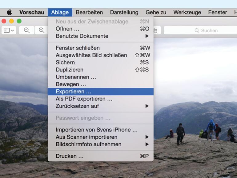 Wählen Sie ein geeignetes Bild aus und ändern Sie, falls nötig, das Dateiformat. Dazu öffnen Sie es mit Vorschau, wählen „Ablage > Exportieren“ und im Aufklappmenü „Format“ den Eintrag „JPEG“.