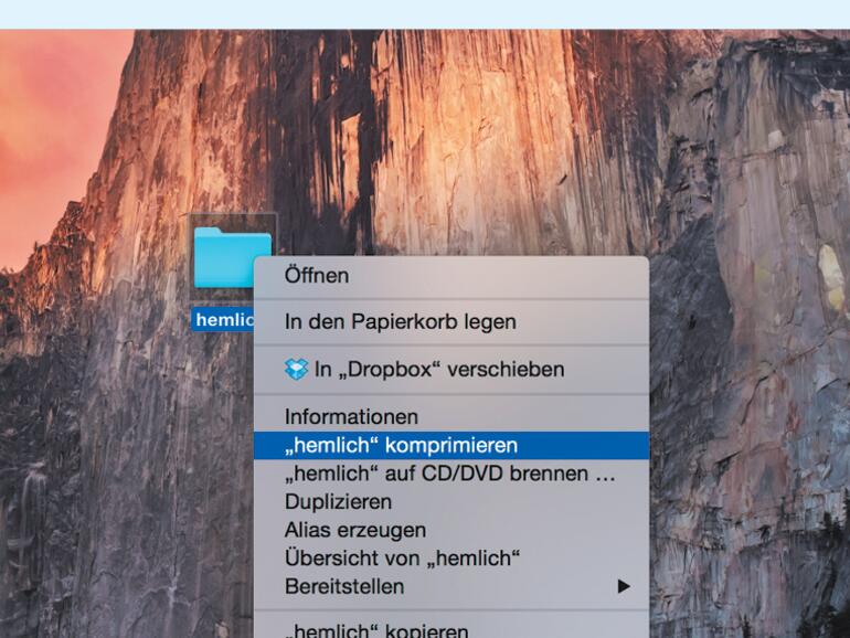 Wie aber versteckt man denn Dateien in Fotos? Zunächst benötigen Sie eine Bilddatei im PNG, JPG- oder GIF-Format. Zudem müssen Sie die Daten, die Sie unauffällig versenden möchten, komprimieren und im Zip-Format abspeichern. Dies macht OS X ohne zusätzliches Hilfsprogramm. Klicken Sie dazu mit der rechten Maustaste auf die entsprechende Datei oder einen Ordner, den Sie komprimieren möchten, und wählen Sie im aufpoppendem Kontext-Menü den Eintrag „[Datei/Ordnername] komprimieren“.
