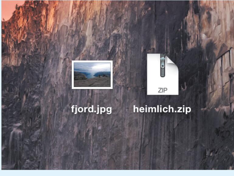 Bewegen Sie Foto und Zip-Datei auf den Schreibtisch. Nun starten Sie das Terminal-Programm und geben nacheinander zwei kurze und leicht zu merkende Befehle ein. OS X erzeigt daraufhin eine neue Bilddatei, die die entsprechenden Daten enthält. Die beiden Terminalbefehle finden Sie im Workshop auf der nächsten Seite.