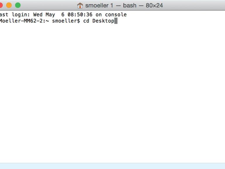 Starten Sie das Terminal-Programm („Finder > Gehe zu > Dienstprogramme“). Tippen Sie im Programmfenster den Befehl „cd Desktop“ (ohne Anführungszeichen) und drücken Sie die Enter-Taste.