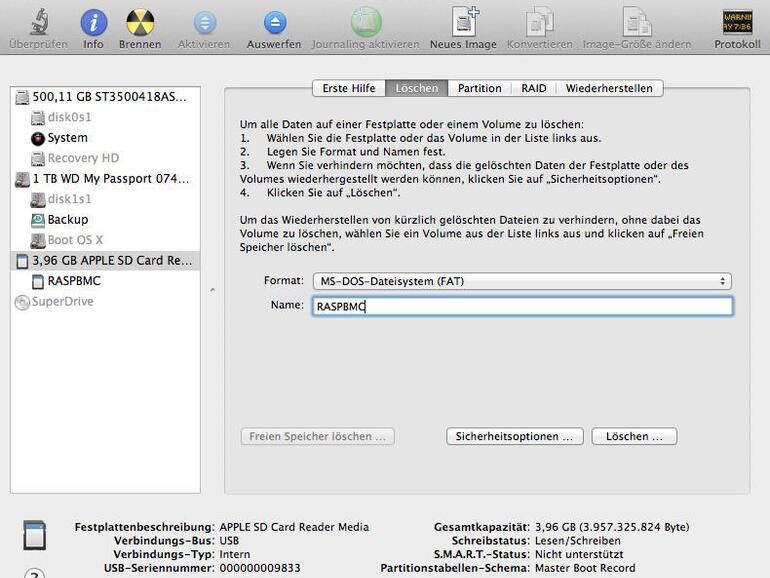 Stecke eine SDHC-Speicherkarte mit mindestens 4 GB Speicher in den Mac-Kartenleser. Formatiere sie mit dem Festplatten-Dienstprogramm im „MS-DOS-Dateisystem“. Gib dabei dem Datenträger einen eindeutigen Namen, etwa „RASPBMC“.