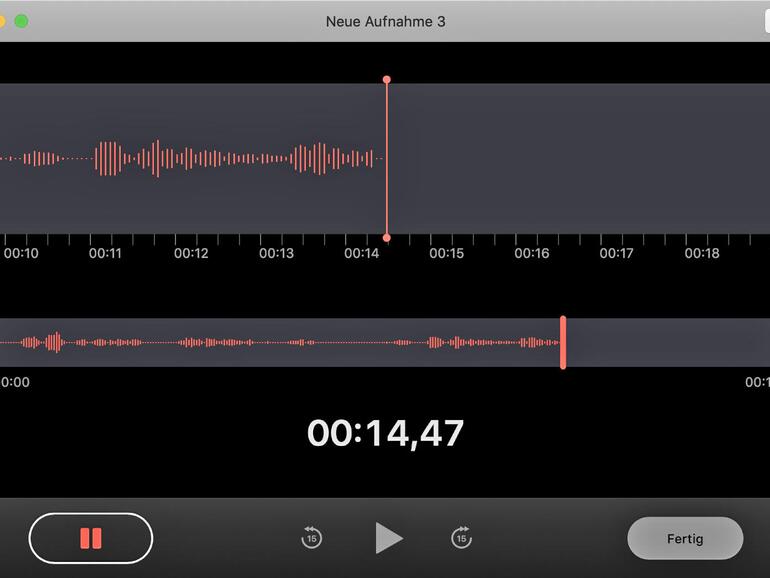 Funktionieren tut die App aber auch auf dem Mac: Nach dem Drücken des Aufnahmeknopfs spricht man seine Bemerkungen auf und kann sie noch leicht bearbeiten und kürzen. Die Qualität der Aufnahmen ist mit einer Samplingrate von 48 Kilohertz sehr hoch, allerdings kann das Standardmikrofon der Macs da kaum mithalten. An Sprachmemos sieht man exemplarisch auch die Nachteile der iOS-Umgebung, denn eine Exportmöglichkeit für Aufnahmen fehlt, stattdessen gibt es nur das iOS-typische und arg limitierte Teilen-Menü.