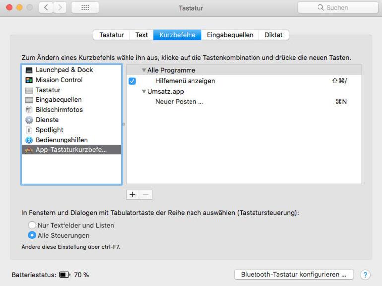 Öffnen Sie die Systemeinstellungen des macOS. Unter „Tastatur“ wählen Sie den Reiter „Kurzbefehle". In der linken Spalte wählen Sie die Kategorie „App-Tastaturkurzbefehle“ aus.