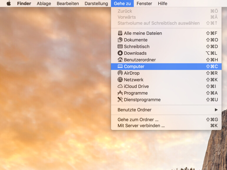 Schritt 1: Klicken Sie in der Menüleiste am oberen Bildschirmrand auf „Gehe zu“ und wählen „Computer“ aus dem Menü aus.