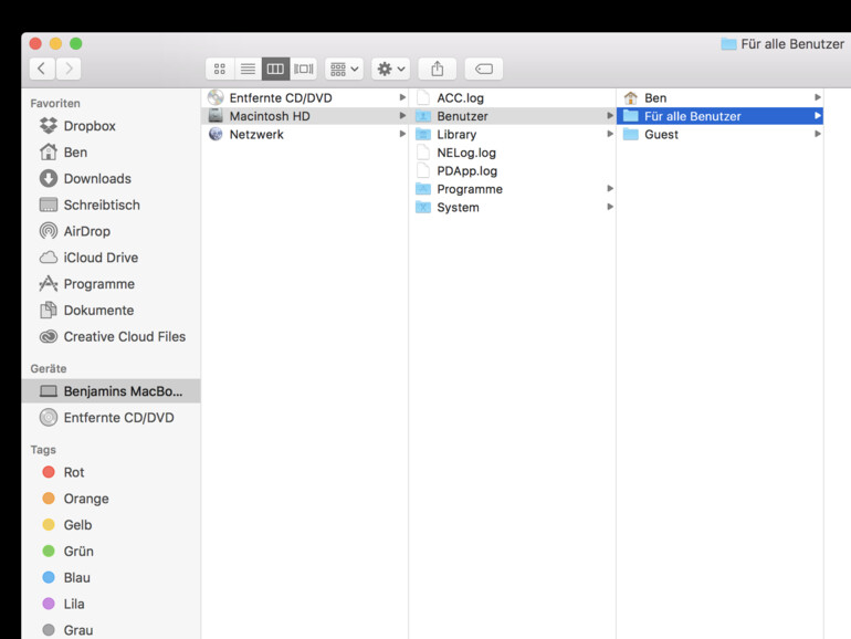 Schritt 4: Ihnen wird nun der eigener Benutzerordner angezeigt sowie die der anderen Nutzer. Der Ordner „Für alle Benutzer“ kann nun für den Dateiaustausch zwischen den einzelnen Konten genutzt. Kopieren oder verschieben Sie die gewünschte Datei einfach in den Ordner und jeder andere Nutzer dieses Macs kann darauf zugreifen.