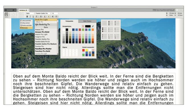 Beim Tippen vergrößert Designer 3 das Textfeld zur besseren Übersicht. Mit der Werkzeugleiste wählen Sie unter Schriftarten die Größe, Farbe und viele weitere Parameter aus. Auch Ausrichtung, Einrückung und sogar die Art der Aufzählung bei strukturierten Texten können Sie selbst festlegen.
