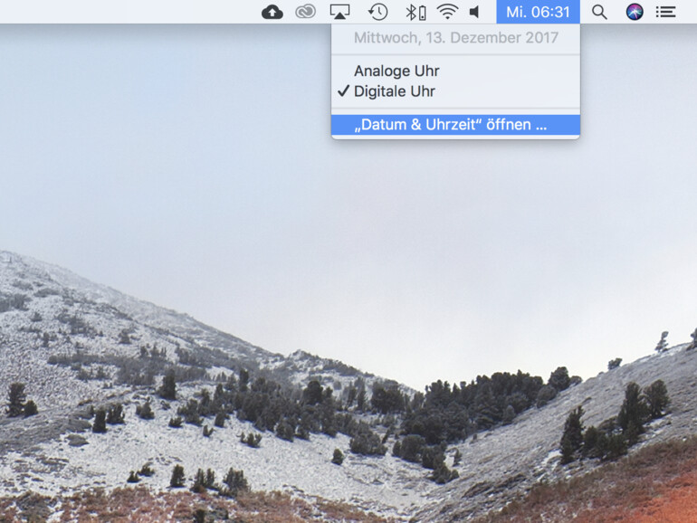 Klicken Sie in der Menüleiste auf die angezeigte Uhrzeit, sodass sich ein Kontextmenü öffnet, und wählen dann aus dem Menü „„Datum & Uhrzeit“ öffnen" aus.