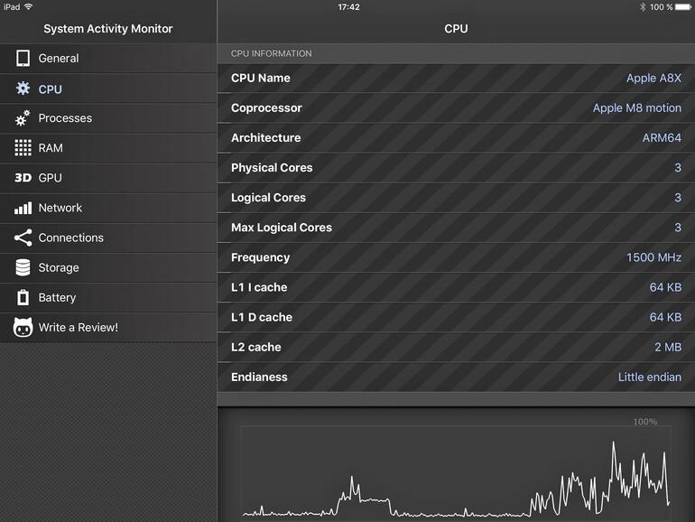 Der System Monitor Ultimate ist eines der simpleren, dafür aber übersichtlichen Systemtools und zeigt exemplarisch, was man von diesem Genre erwarten kann: Nach der Auswahl von CPU, Netzwerk oder Speicher zeigt die App alle relevanten Daten zu diesem Thema übersichtlich an. Zu vielen der Punkte gibt es eine schlichte, aber übersichtlich gehaltene Aktivitätsanzeige mit zeitlichem Verlauf. So lässt sich aufdecken, ob das Laden und Darstellen einer Website nur Netzwerklast verursacht oder eher der Prozessor mit der Darstellung nicht hinterherkommt. Wie alle Systemtools protokolliert die App maximal drei Sekunden im Hintergrund weiter. Was den System Monitor Ultimate etwas heraushebt, ist seine Fähigkeit, alle offenen Netzwerkverbindungen aufzulisten. So sehen erfahrenere Anwender, welche App gerade auf welche Weise nach Hause telefoniert. Den größeren Schirm des iPad nutzt die App recht gut aus.