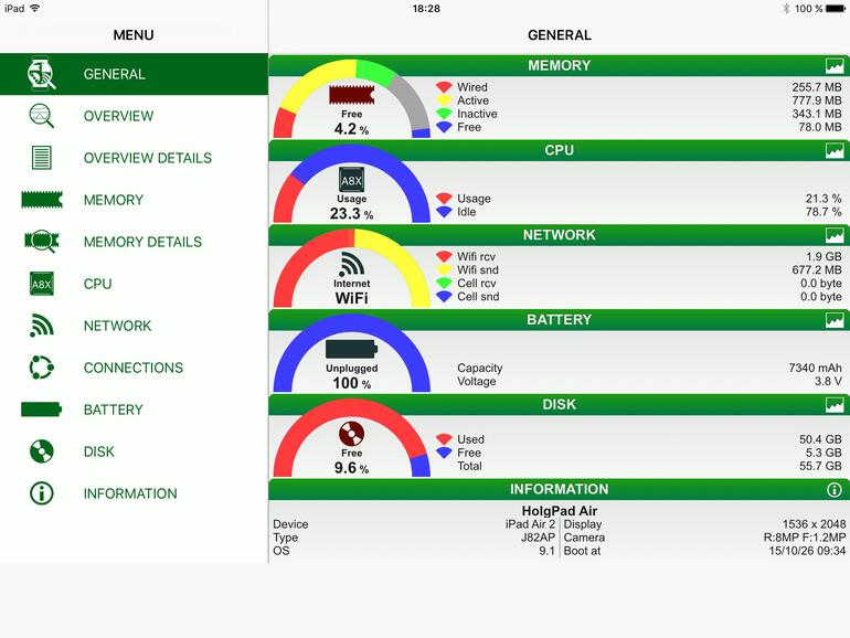 Doch die Zeiten, in denen Programme einen Rechner noch schneller machen konnten wie früher einmal die Festplatten-Defragmentierer sind längst vorbei, heutzutage geht es allenfalls noch um Informationen und die Antwort auf Fragen. Wer wissen möchte, wie stark der Prozessor ausgelastet ist oder ob es noch freien Speicher auf dem Gerät gibt, mag dafür eines der hier vorgestellten Tools nutzen. Aber iOS nennt die wichtigsten Daten auch freiwillig: An Infos zum genutzten Netzwerk, die Gerätedaten und Weiteres kommt man über die Einstellungen heran, nur muss man sich die relevanten Aussagen mühsam zusammenklauben, während die hier vorgestellten Apps sie gut zusammenfassen und deutlich besser aufbereiten.