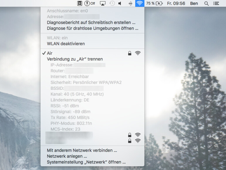 Halten Sie die Optionstaste (alt) auf Ihrer Tastatur gedrückt und klicken Sie mit der linken Maustaste auf das WLAN-Icon in der Menüleiste am oberen Bildschirmrand.