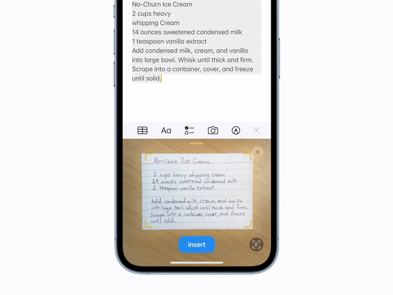 Öffne dazu deine Notizen-App auf deinem iPhone oder iPad und tippe in einer Notiz auf das Kamera-Symbol über der virtuellen Tastatur. Wähle nun die Option „Text scannen“ aus und halte die Kamera nun über den einzufügenden Text. Eine Vorschau zeigt dir nun an, ob der Text richtig erkannt wurde. Sobald du fertig bist, tippst du auf „Einfügen“ und schon ist der Text in der Notizen-App digitalisiert. Übrigens funktioniert dies auch in „Erinnerungen“.