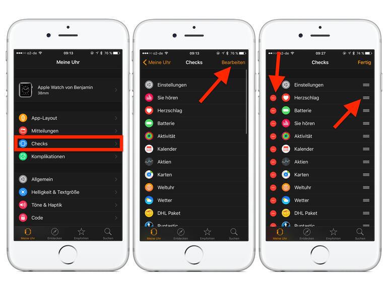 Hinweis: Du kannst nicht alle Apple Watch Checks entfernen. Der Check für die Einstellungen bleibt stets aktiv und kann lediglich verschoben werden.