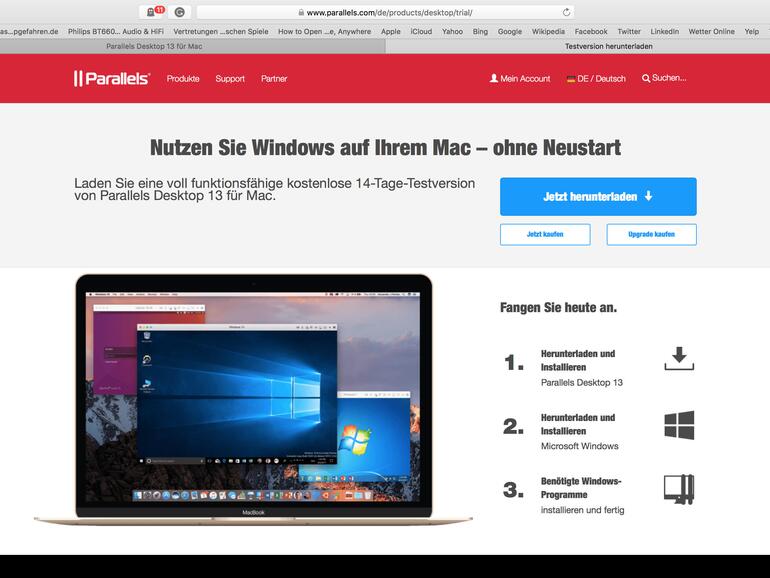 Gehen Sie auf parallels.com/de und laden Sie sich die aktuelle Version Parallels Desktop 13 herunter. Zum Ausprobieren gibt es auch eine kostenlose Testversion, die Ihnen 14 Tage lang zur Verfügung steht.