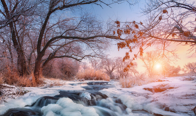Im Winter wirken Sonnenuntergänge besonders intensiv und Sie müssen dafür nicht mal lange wach bleiben. Unabhängig von der Jahreszeit zählen Sonnenuntergänge zu den beliebtesten Motiven überhaupt. Besonders imposante Aufnahmen gelingen dabei häufig im Winter. Dank Winterzeit und kurzer Tage geht die Sonne bereits sehr früh unter, wodurch auch spontan direkt nach Feierabend ein tolles atmosphärisches Bild entstehen kann. Die klare, kalte Winterluft intensiviert die Lichtstimmung, Eis und Schnee liefern einen tollen Kontrast zur Wärme des Abendlichts und verdecken zudem störende unruhige Bildelemente am Boden wie umgepflügte Äcker oder vertrocknete Wiesen.
