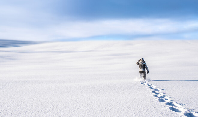 Trittspuren verleihen minimalistisch-tristen Schnee-Aufnahmen mehr Leben. Wenn im Winter Schnee die Landschaft überzieht, verwandelt er den Boden in eine glitzernde, perfekt glatte weiße Fläche. Fotografen ermöglicht diese Schneedecke tolle minimalistische Bilder, die ohne zusätzliches Motiv, wie beispielsweise einem einzeln stehenden kahlen Baum oder einer Hütte, allerdings etwas verloren wirken. Als perfektes Hauptmotiv eignet sich aber auch in solchen Fällen eine durch den Schnee stapfende Person. Sie hilft dem Betrachter, die Größenverhältnisse einzuschätzen und erzählt dank der Fußspuren eine ganz eigene, spannende Geschichte.