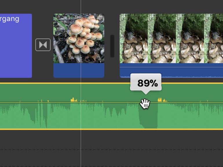 Neben Musikstücken und Toneffekten lässt sich auch die in einem Videoclip vorhandene Tonspur auf einfache Weise anpassen. Führen Sie dazu einen Rechtsklick auf einen Clip in der Timeline aus und wählen Sie anschließend den Eintrag „Audio trennen“. Nun befindet sich die Audiospur als separates Element in der Timeline, dessen Bearbeitungsfunktionen denen eines Musikstückes entsprechen.