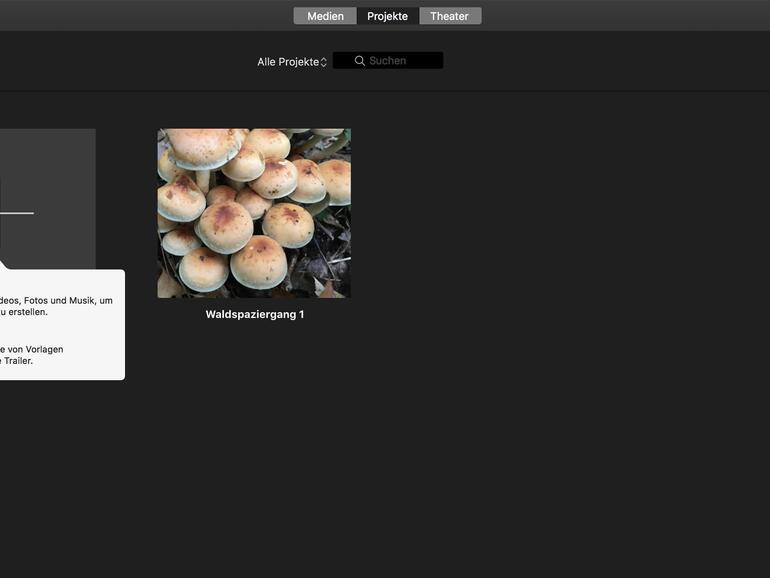 Wenn Sie iMovie zum ersten Mal öffnen, befinden Sie sich in der Regel bereits in der Projektübersicht. Ist das jedoch nicht der Fall, so gelangen Sie durch einen Klick auf die Schaltfläche „Projekte“ in der Titelleiste des Fensters zur gewünschten Übersicht. Klicken Sie dort auf die große Schaltfläche „Neues Projekt“ und wählen Sie anschließend den Eintrag „Film“ aus.