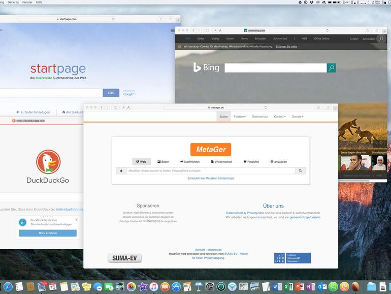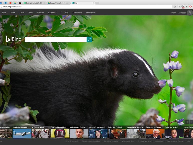 Bing ist der Riese unter den Suchmaschinenzwergen. Vor allem in den USA ist der Marktanteil des Microsoft-Dienstes deutlich höher als hierzulande. Bing kann bezüglich der Suchergebnisse und ihrer Präsentation durchaus dem großen Bruder Google das Wasser reichen. Es bietet annähernd so viele Zusatzfunktionen, wie zum Beispiel Karten, Nachrichten und eine Bildersuche. Bing ist in Windows integriert und im Design an Windows 10 angelehnt – es findet daher wohl eher unter PC- als unter Mac-Anwendern Freunde.