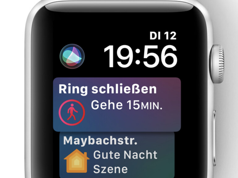 Apple hat der Apple Watch ein neues Ziffernblatt spendiert, welches Siri als persönlichen Assistenten nutzt. Damit zeigt man Ihnen kommende Termine, das Wetter, Börsenwerte sowie einige weitere Informationen an, die ständig aktualisiert werden. Per Digital Crown können Sie die einzelnen Kacheln durchsehen. Daneben verfügt das Ziffernblatt über zwei frei konfigurierbare Komplikationen, die Ihnen standardmäßig Siri und das aktuelle Datum anzeigen. Während Ihnen die Sekunden nicht direkt eingeblendet werden, blickt jedoch der Doppelpunkt zwischen der Stunde und den Minuten im Sekundentakt.