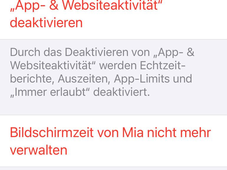 Mit „Bildschirmzeit von NAME nicht mehr verwalten“ schaltest du alle Funktionen auf einmal wieder frei und gewährst dem Kind den vollen Zugriff auf sein Smartphone.