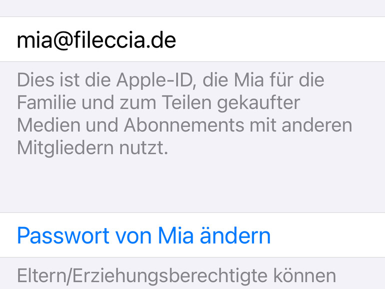 Unter „Einstellungen > Familie > NAME > Apple-ID & Passwort“ kannst du jederzeit das Passwort des Kindes ändern. Hier heißt unser Musterkind Mia Musterfrau.