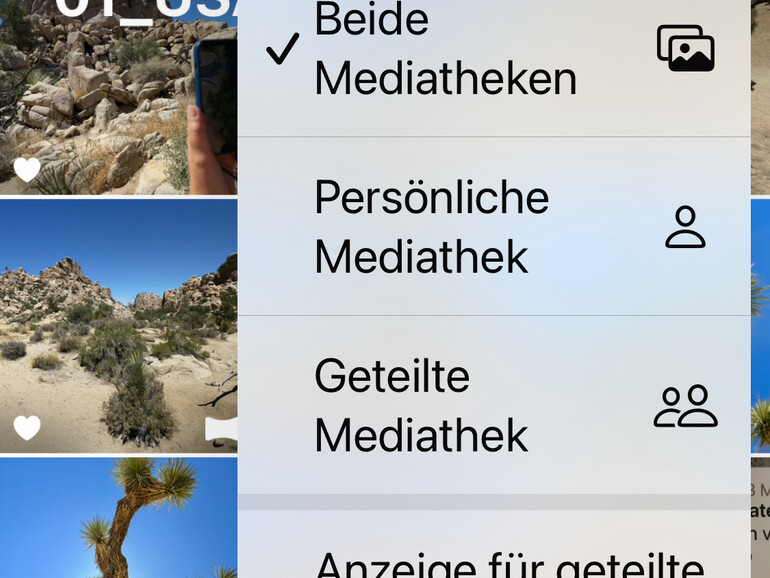 Öffne die „Fotos-App“, über die drei Punkte oben rechts. Du siehst „Beide Mediatheken“ oder nur eine der beiden „Persönliche Mediathek“ oder „Geteilte Mediathek“.