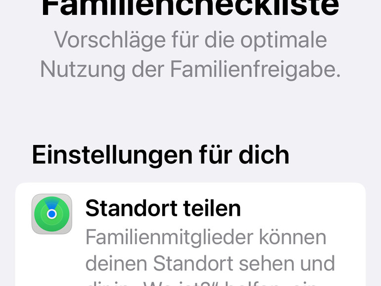 Apple stellt eine „Familiencheckliste“ bereit, die die wichtigsten Einstellungen im Überblick zeigen: „Einstellungen > Familie > Familiencheckliste“.