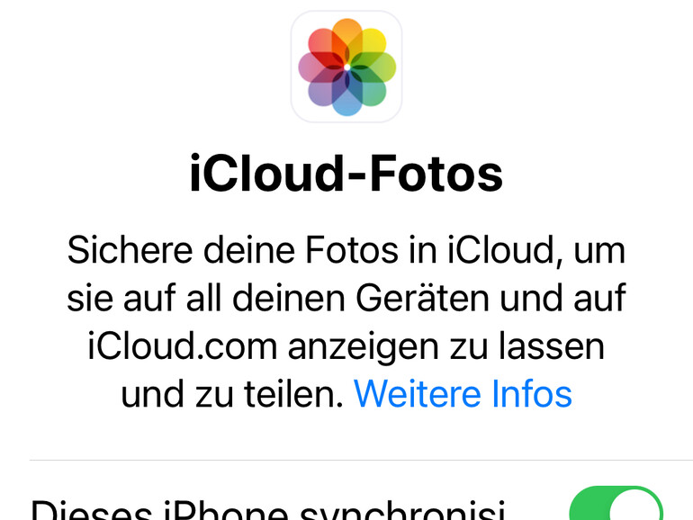 Voraussetzung ist die „iCloud-Fotomediathek“, die unter „Einstellungen > NAME > iCloud > Fotos > Dieses iPhone synchronisieren“ eingeschaltet sein muss.