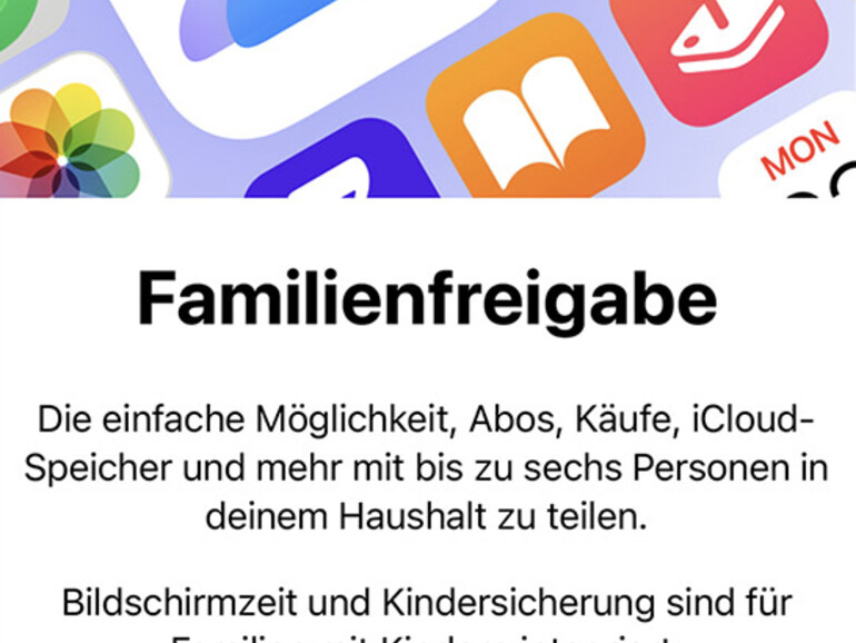 Öffne „Einstellungen“, tippe auf deinen Namen und dann auf „Familienfreigabe“ und richte deine Familie ein. Apple lässt maximal fünf weitere Mitglieder zu.