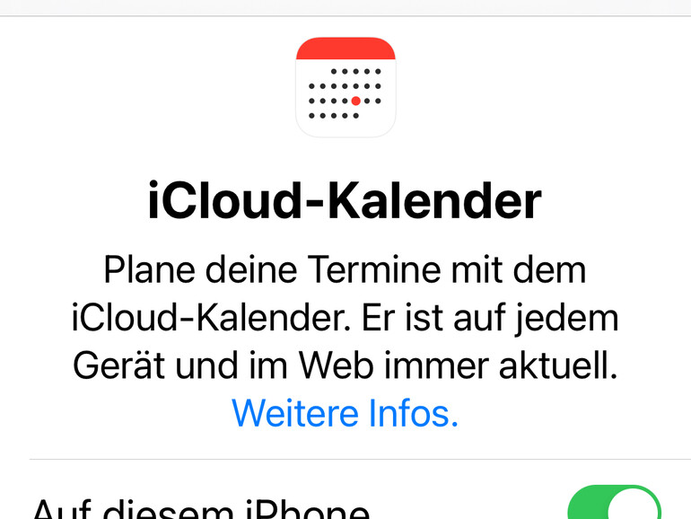 Für den gemeinsamen Familienkalender muss eingeschaltet sein: „Einstellungen > NAME > iCloud > (eventuell „Alle anzeigen“) iCloud-Kalender > Auf diesem iPhone“.