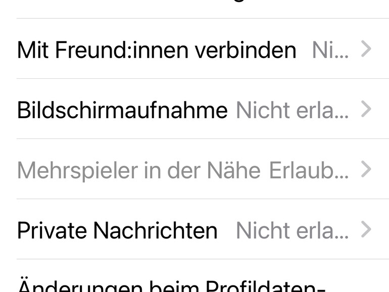 Kontaktaufnahmen verhindern: „Einstellungen > Bildschirmzeit > Familie > NAME > Beschränkungen > Inhaltsbeschränkungen“ (nach unten scrollen) – „ Game Center“.