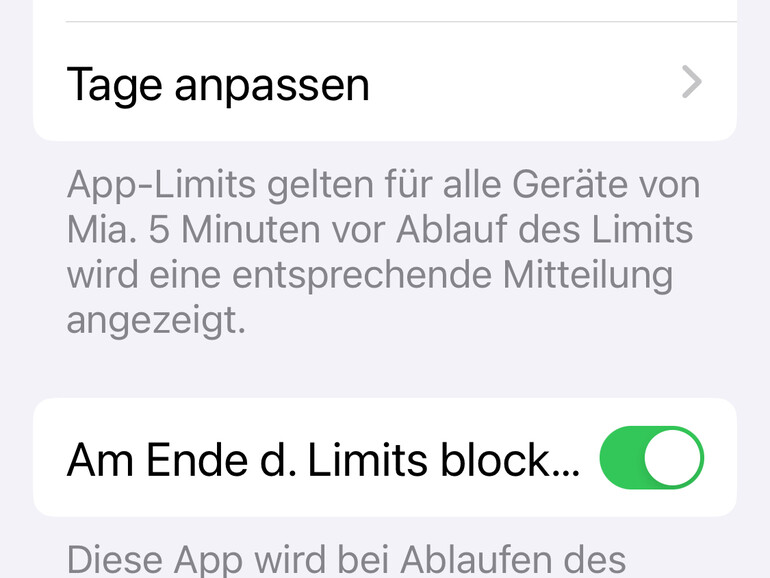 Du kannst genau festlegen, welche Apps oder App-Kategorien wie Spiele wie lange genutzt werden dürfen: Bildschirmzeit > Einstellungen > App-Limits> App-Limit“.