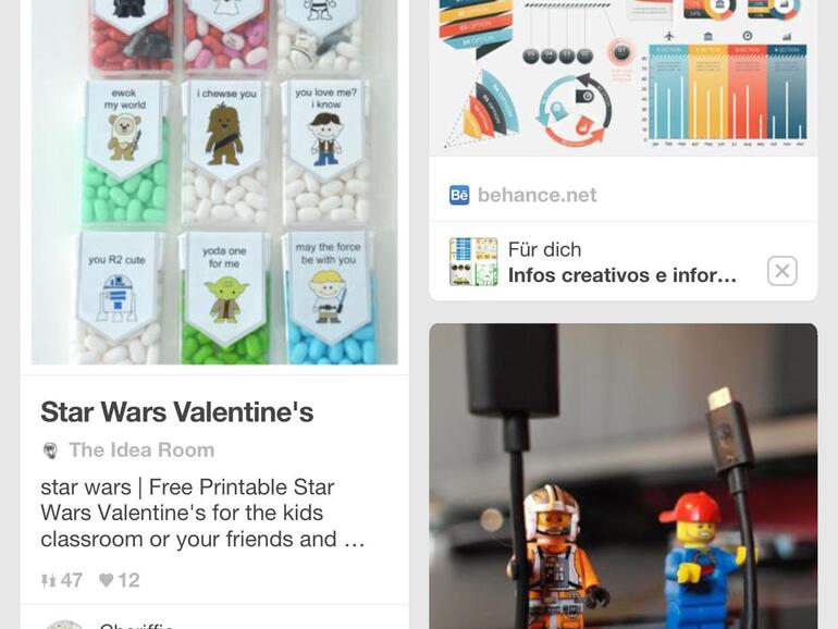 Nach Starten der App und der Anmeldung erscheint der Start-Feed – das ist eine Sammlung von Pins, Pinnwänden und Interessensgebieten, denen ein Nutzer folgt. Dazu mischt Pinterest auch Werbe-Pins passend zu den Interessen.